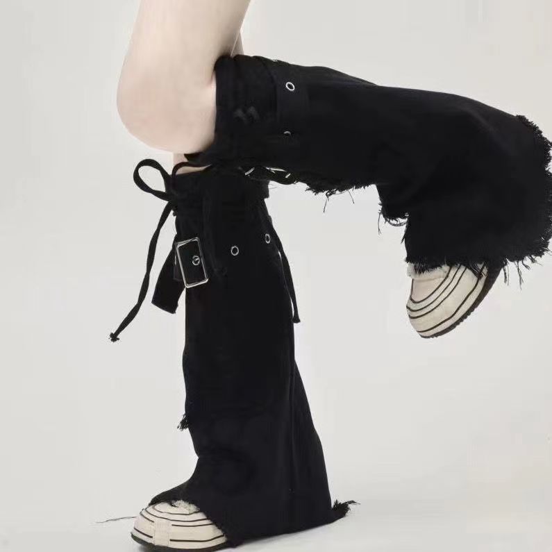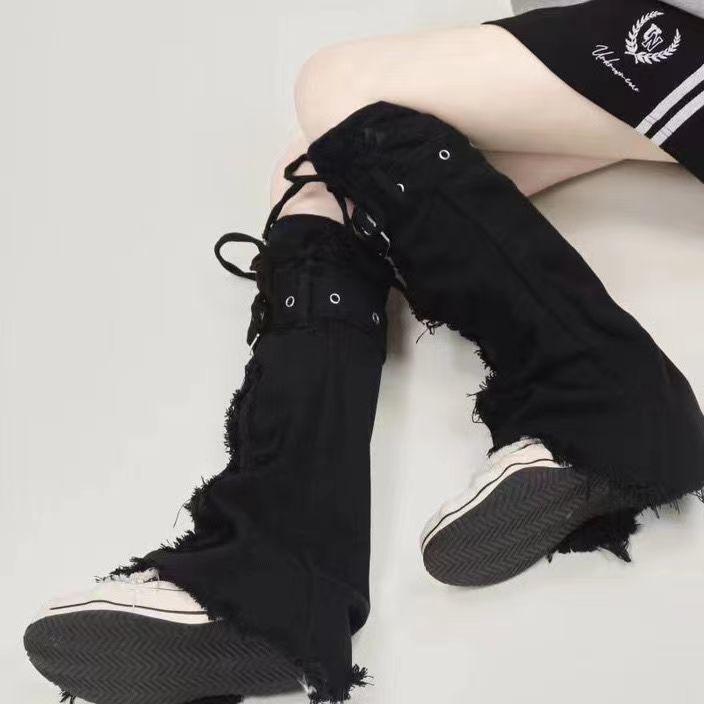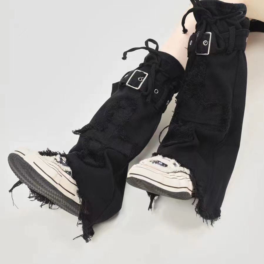 Stylish Y2K design: Trendy black denim leg covers with a fashionable cross pattern.